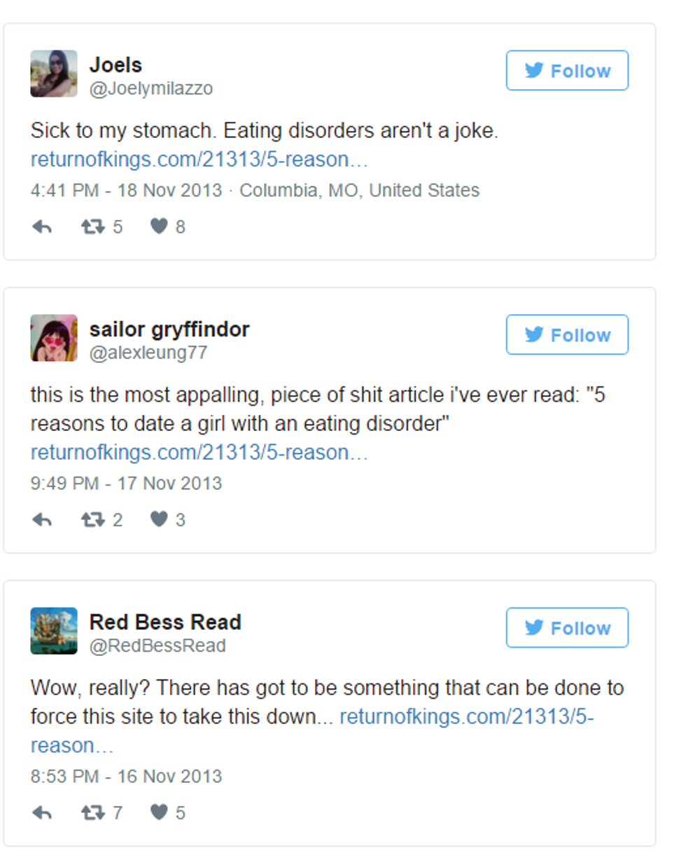Some time ago, an article was published by Return of Kings, titled "5 Reasons To Date A Girl With An Eating Disorder." The article obviously sparked up a lot of controversy. Not only on social media sites like Twitter and Facebook, but on other news site. Popular sites like Cosmopolitan, Huffington Post, and Daily Mail all jumped to point out the fact that this article was disgusting, for more reasons than one.