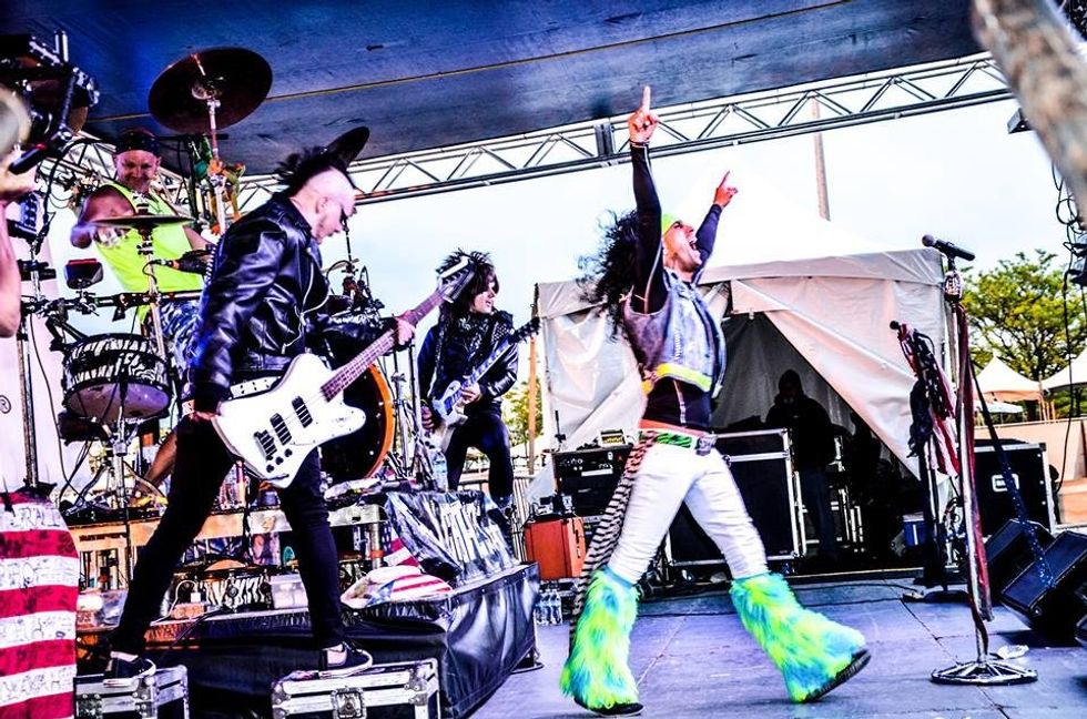 The late, but absolutely great, Jake "the Sandman" Sanders is seen rocking in interesting but awesome look at a show in the photo above. Each members has their own unique style, and they know just how to strut their stuff while looking absolutely flawless. Cam, the lead singer and one of the founding members of the group, can often be seen donning a bandanna, a Buc-ces belt buckle, and some fuzzy legwarmers while Chase "the Ace" West, guitarist for the band, is known for his Alice Cooper-esque eyeliner, tight pants, and huuuuge hair. Chris, the multi-talented drummer, is famous for his shorts and bandanna behind the drumset while the newest member of the band, Max "Maximus Hawk" War coifs his signature mohawk and goatee with a vest.