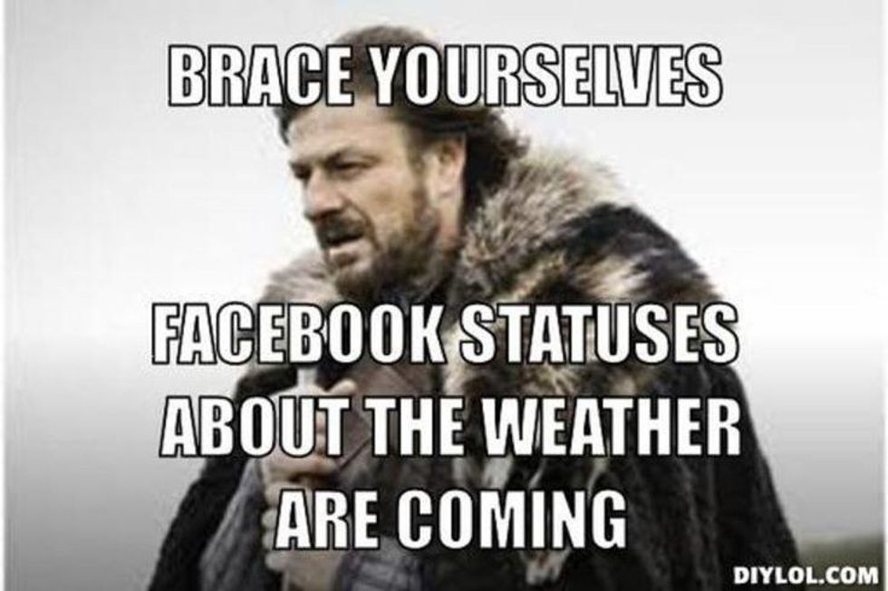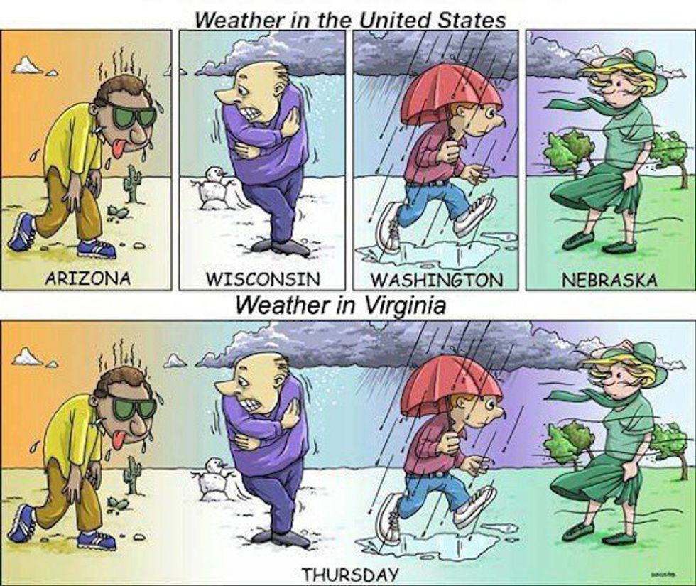 1. Here in good 'ol VA, we get to experience all four seasons—in a single day. Better have an umbrella, sweater, raincoat, shorts, coat, boots, and sunglasses on hand at all times...