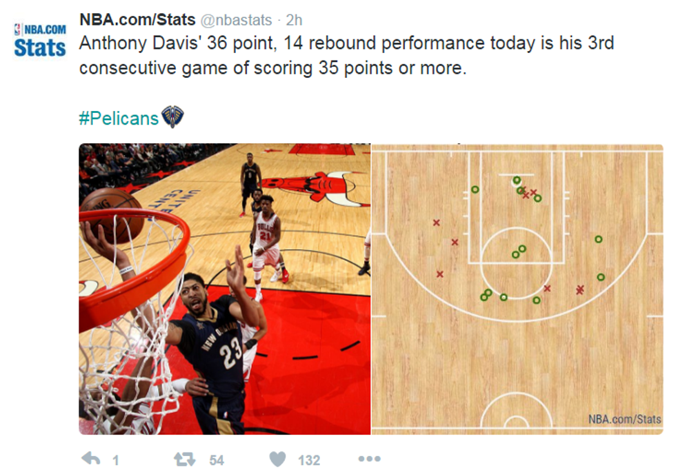 Anthony Davis - seven games this season, scoring at least 35 points, 10 rebounds and 3 blocks; three consecutive games with 35 points or more.