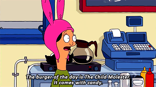 "Oh Linda, sweet sweet Linda, trapped in a bad marriage."-- Louise. Just kidding! Louise is just playing around. Louise is a spunky kid and is always being mischievous and trying to learn right from wrong. Everyone had their firecracker phase, whether it was staying up too late, or pranking a guidance counselor. Tina is a relatable teen, trying to find her way amongst the mean girls, boys, and middle school. Gene is just a kid through and through. He loves music, his mom, and candy. Who can't relate to the love of candy?? Bob is an entrepreneur. He's an artist and an awesome cook. He even writes puns on the burger-of-the-day board. Remember the "girls just want to have FENNEL burger?" Cheesy, but so funny. Bob's a family man and an awesome dad. Bob and Linda are killer parents. Linda always takes her kids seriously, no matter what. Whether it's getting out of a book report, or taking the kids trick-or-treating, Linda always has a literal song and dance ready to make things more fun!