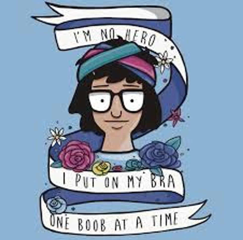 If you haven't seen Bob's Burgers, I highly suggest you try it. You may even find out you connect to the characters more than you ever thought possible! I know I did. Besides, Tina is basically me, handling things with a subtle "UHHH..." and laying on the ground until she figures things out. Besides, I'm no hero. I put my bra on one boob at a time like everyone else.