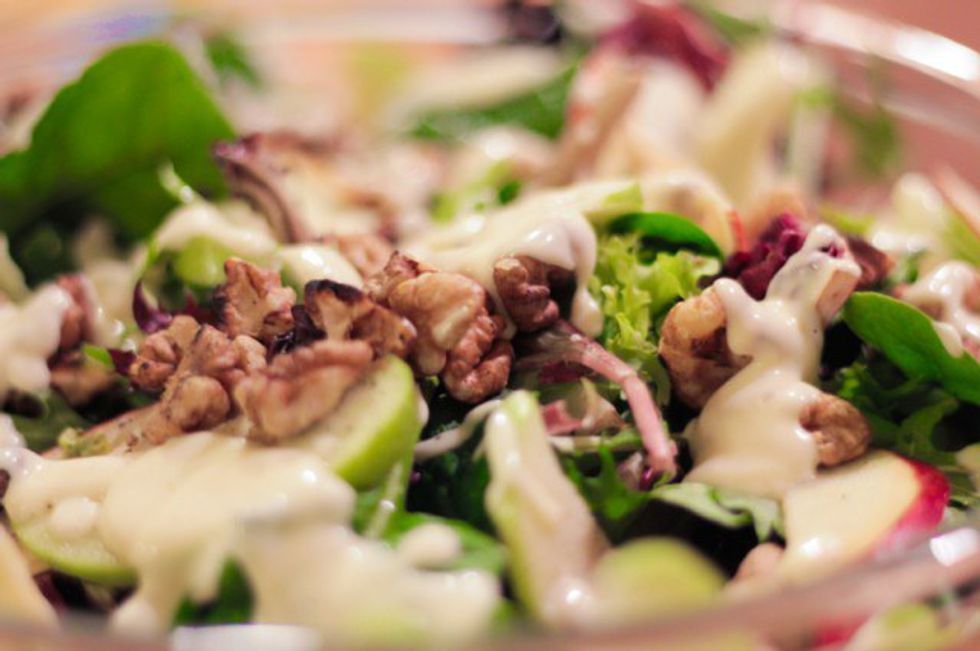 Crunchy walnuts and crispy apples dress up this hearty salad topped with shredded turkey. This looks so good, I want to make it right now!