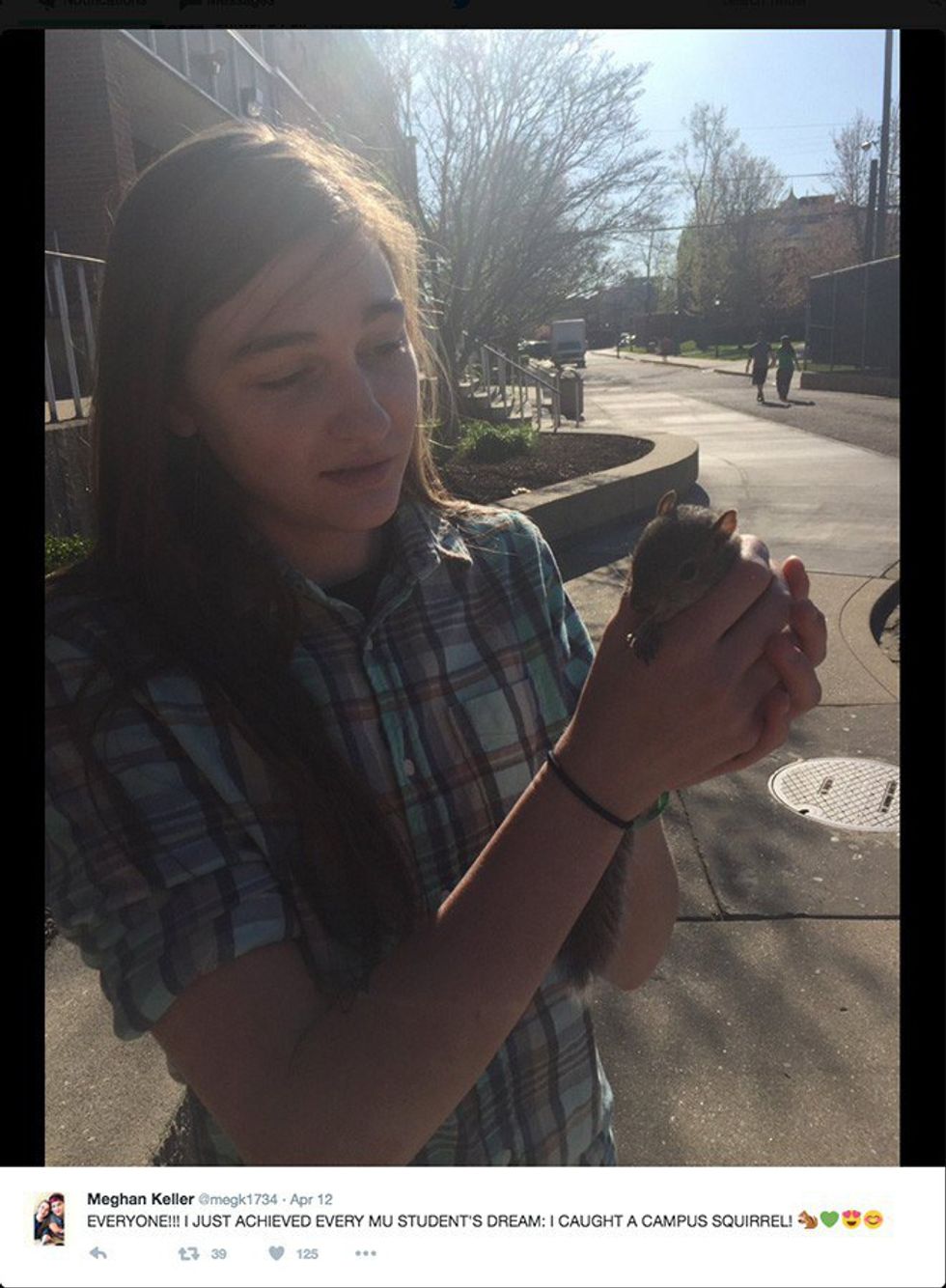Most everyone at Marshall is familiar with the strange behavior of the squirrels on campus. They hide in trash cans and catapult out at inopportune times. I've never actually been struck by a squirrel, but there have been close calls that have involved squeals and ducking. Mostly, like typical squirrels that eat acorns or discarded food left behind by students. I saw a squirrel haul a large chunk of bagel up a tree one time. The squirrels are completely unafraid of students and faculty alike. Last semester, our student newspaper, The Parthenon, reported that a freshman student caught and held a squirrel. Yeah, the squirrels are that infamous here.