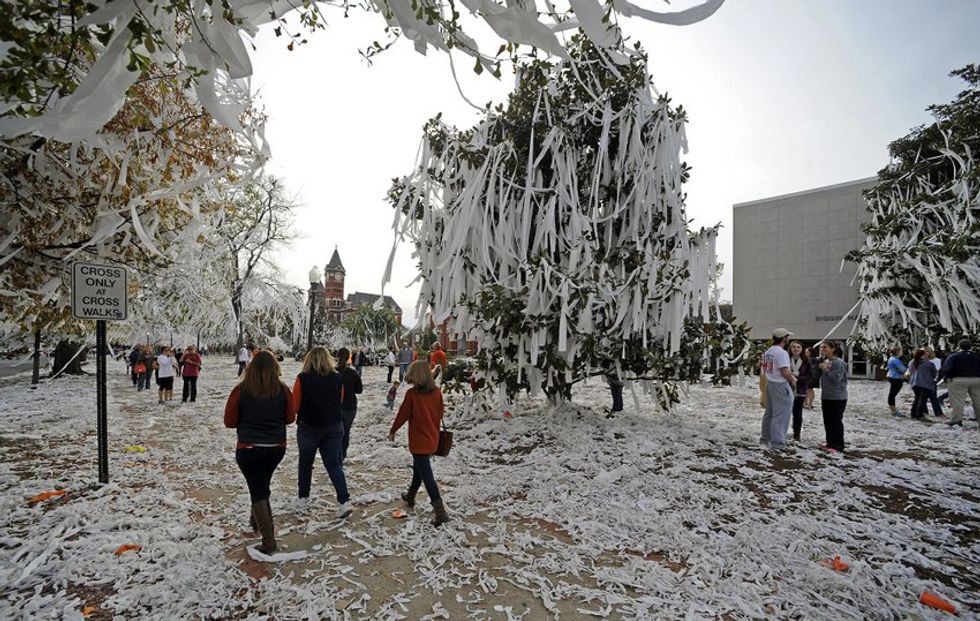Rolling trees is meant as an act of celebration when Auburn wins. When people aren't catching them on fire or poisoning them, it can be called the snow of the south as the white strips blow through the wind.