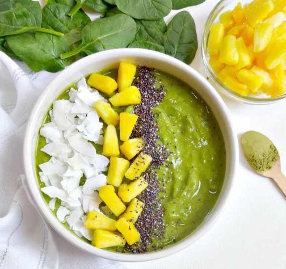Don't be fooled by the color of this bowl because it is packed with nutrients for your body. With the option of adding maca powder (a powder when taken in small amounts, can boost energy and help clear skin) and flaxseed make this bowl different from the others. It's a good choice if you want to get your spinach fix, but you don't want to eat two cups of it by itself.