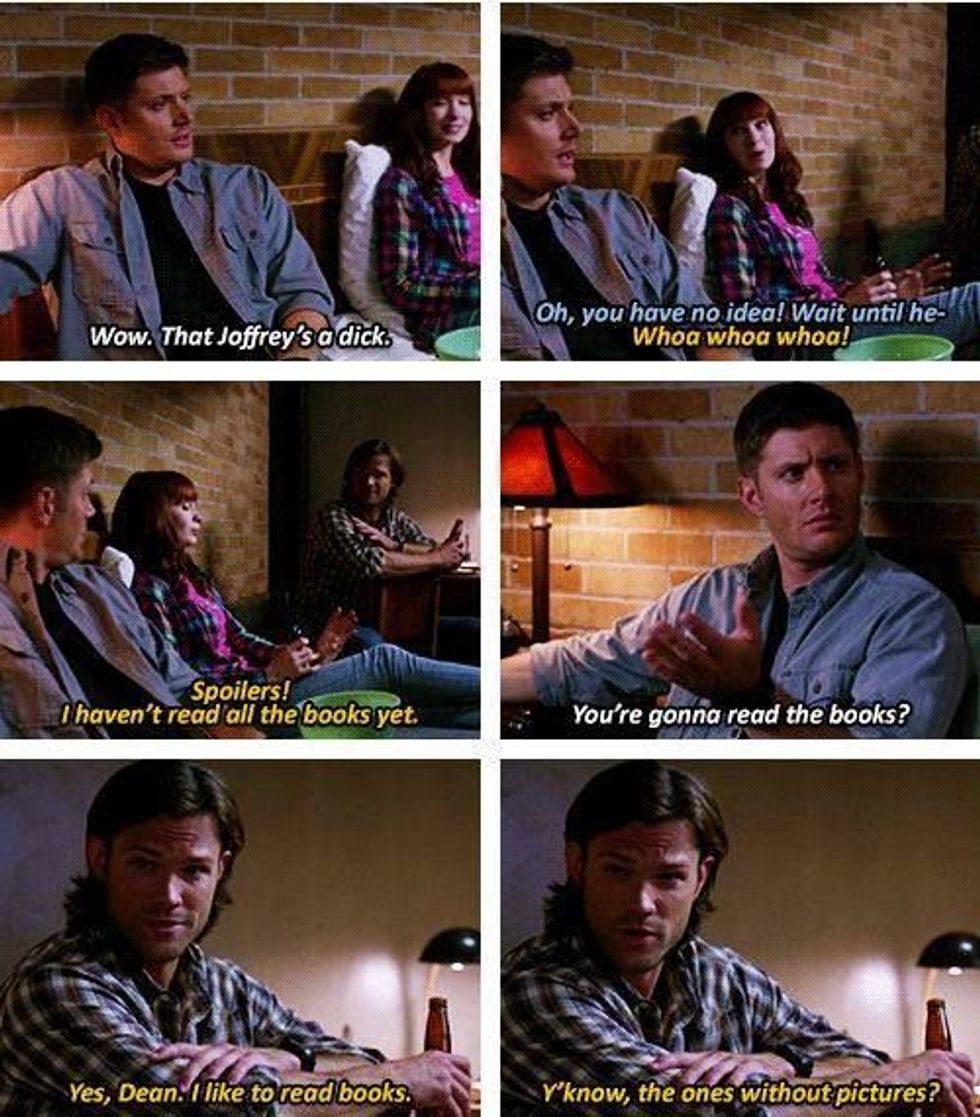People generally have one of three initial reactions when they hear the mention of the show "Supernatural": they might gush about how much they love it, look on with confusion because they've never heard of it, or marvel at the discovery that it's still on. With the finale of Season 12 of "Supernatural" airing last Thursday, I had my third get-together with the friend who got me into the show in the first place, and noticed we had developed a pattern. I figured this was probably relatively universal, and since according to Tumblr, the Supernatural Fandom has a gif for pretty much everything...
