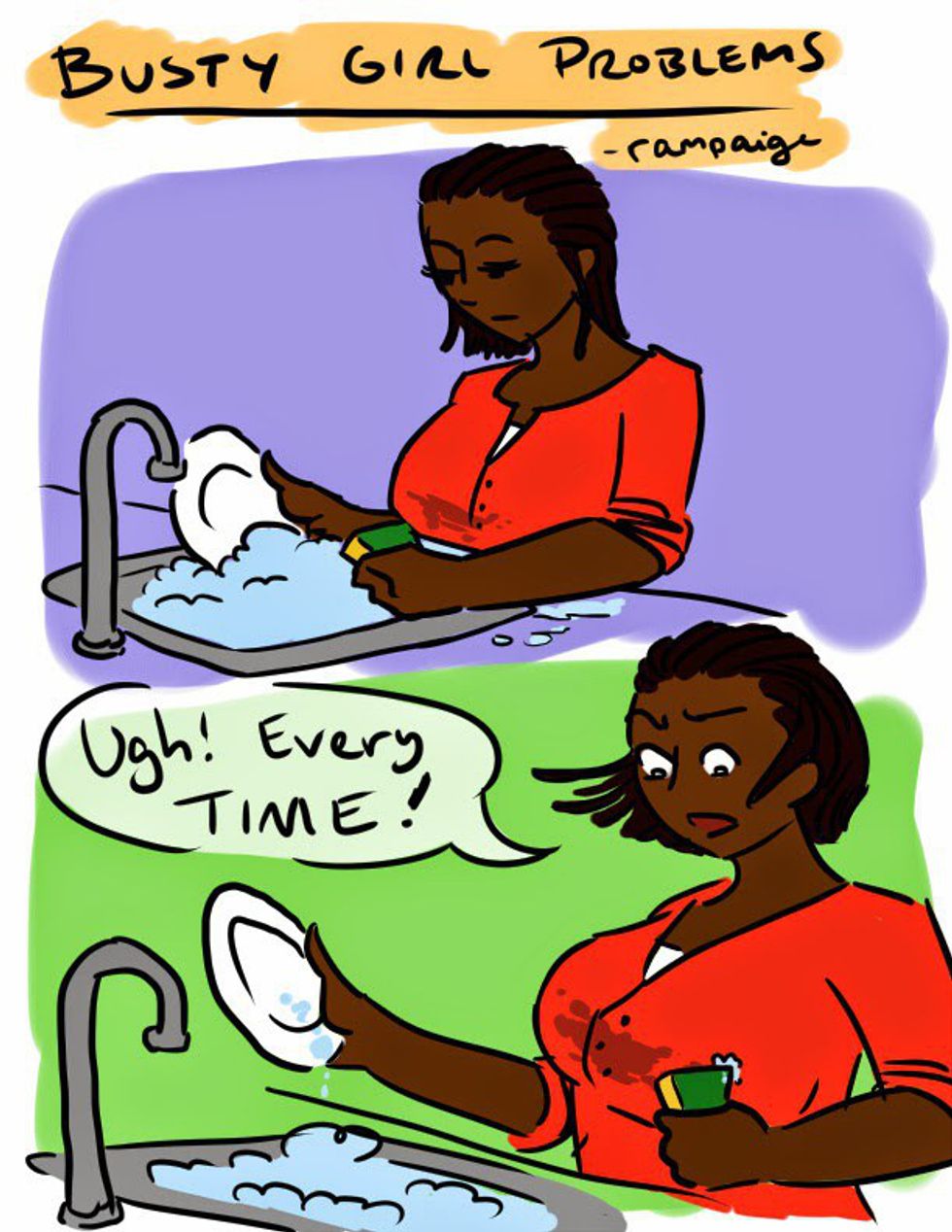 You and your friend wear the same size shirt, except on her it’s a normal length. When you put it on, however, it instantly becomes a crop top because of how large your breasts are. Buying shirts is also super hard because you have to buy things to fit your boobs and then they don’t end up fitting the rest of you. Also, forget anything with a high neck. That just makes your chest look even larger.