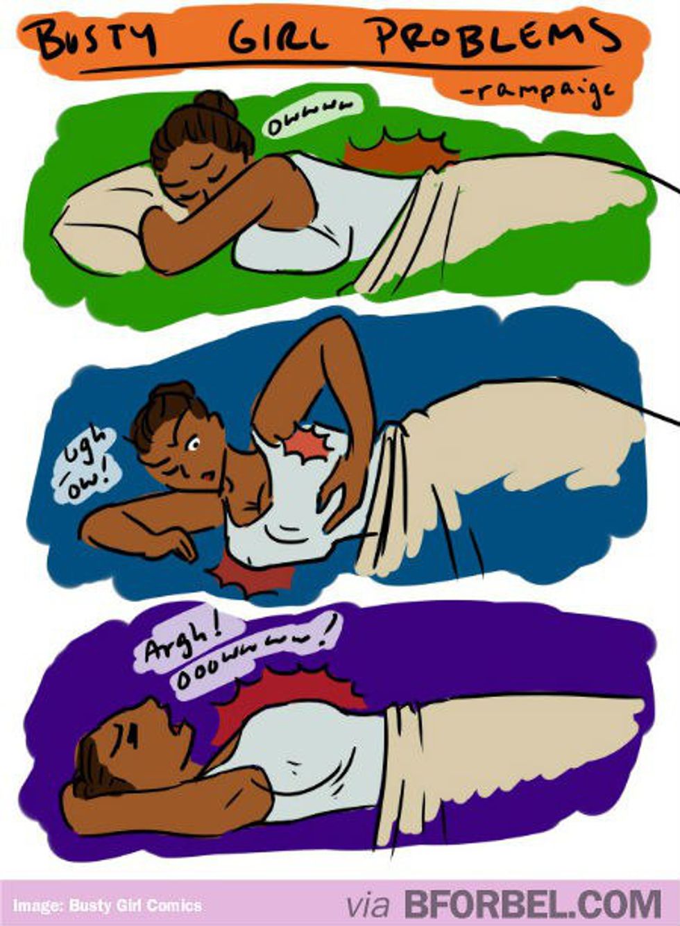 Lying on your back is hard because they move up into your neck and press on your airway. Maybe I’m over exaggerating, but my point is that they basically swallow your entire neck and make you look and feel like some mutated creature thing. But, lying on your stomach isn’t really much better because then they get sore from being pressed on for so long. Getting comfortable when you have big boobs can be a difficult task.
