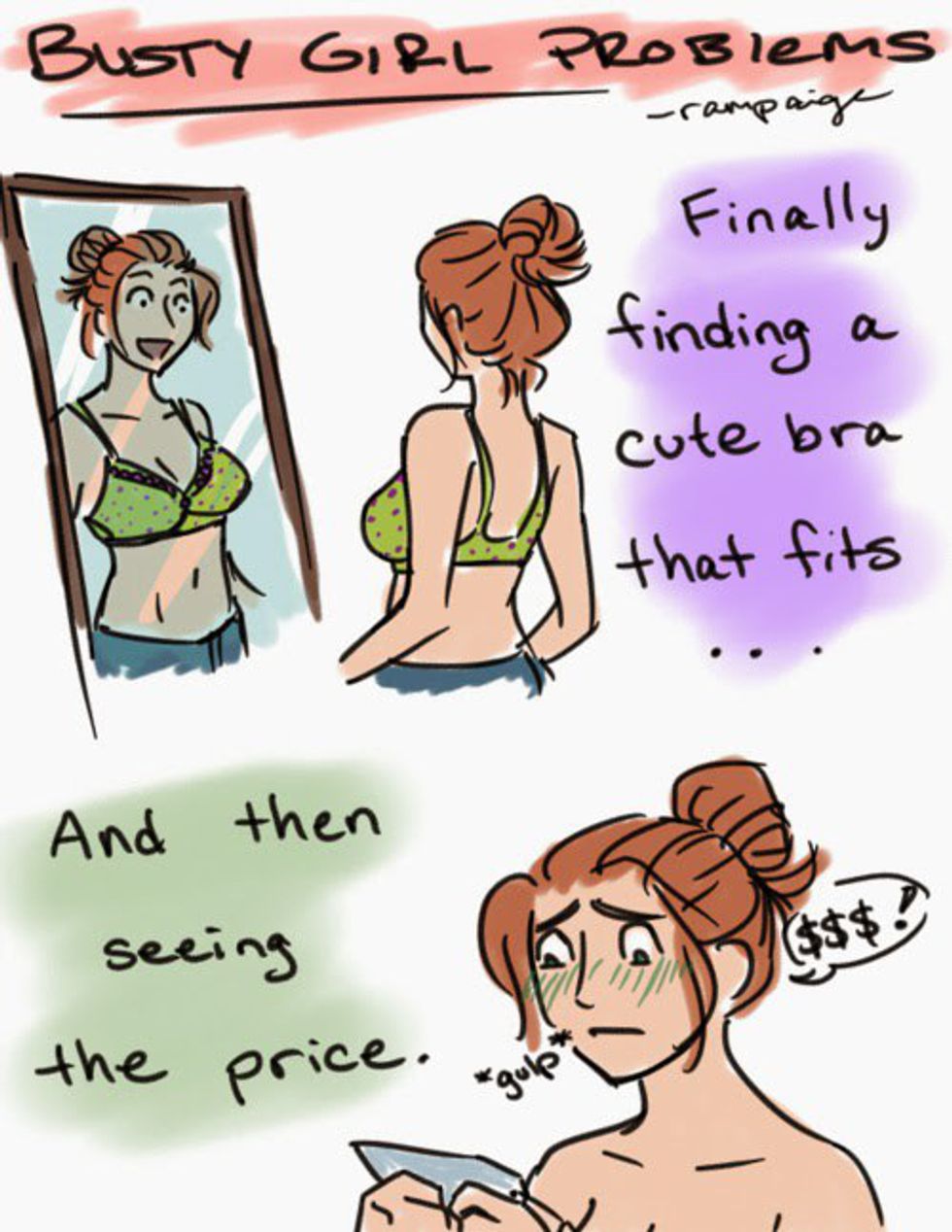 Buying new bras is literally the epitome of our existence. When you have more to hold up, your bras wear out WAY quicker than someone who wears an A. Shopping for new bras when you are busty is such a long, dreadful process. It takes forever because you have to literally try on 40 bras before you find a single one that fits right and then when you do find one it costs $70 for a single one! It’s so infuriating to have to spend so much money on something you have to have!