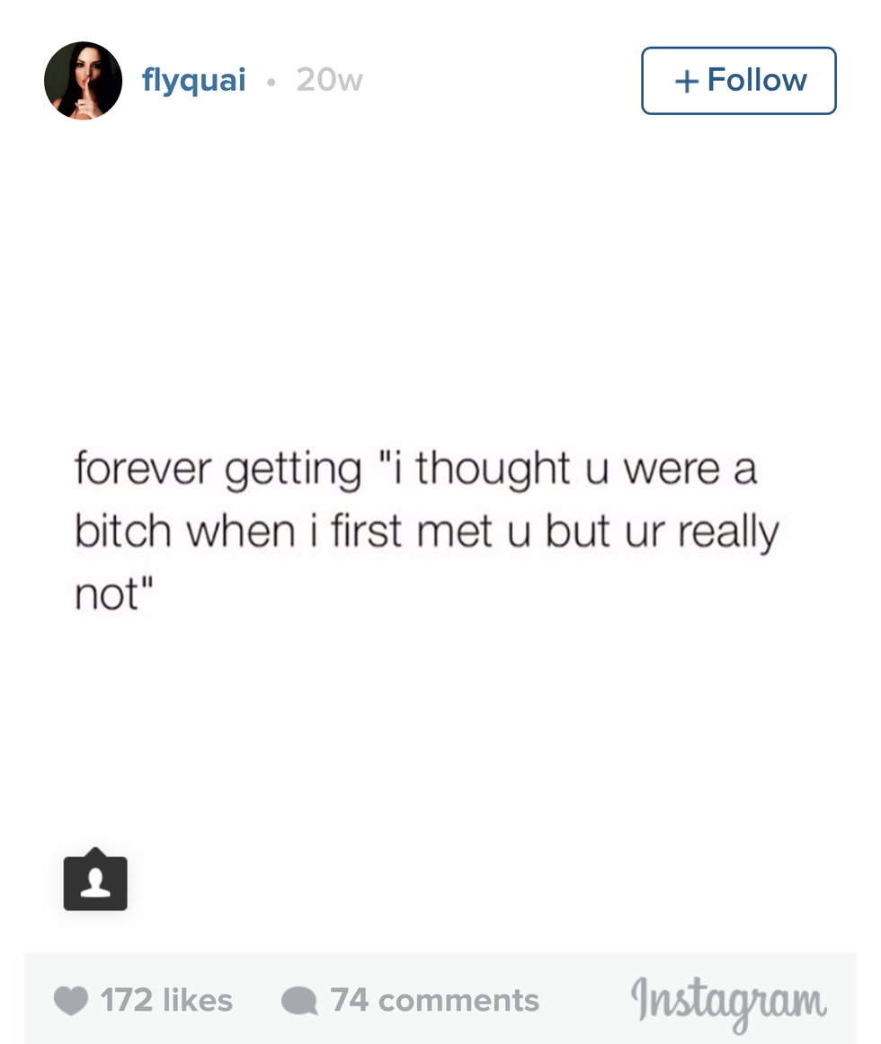 If you’ve been told any of these phrases, you probably have found out one way or another that you are one among many of the unfortunate who suffer from RBF, or better known as "Resting Bitch Face". It can be a blessing or a curse—but no matter what, more than likely people’s first impressions will be somewhere along the lines of them thinking you didn’t like them. Here are five things that all of us RBF patients can relate to.