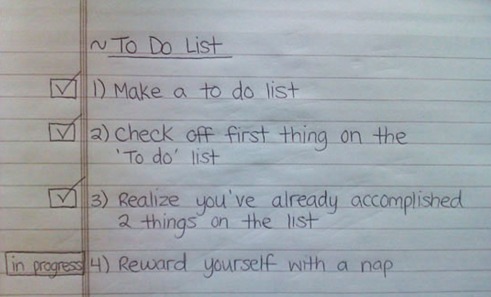 Scratching out things on a list is the best feeling in the whole wide world. I need to make a to-do list to fill out my calendar for this month, a to-do list to do my homework I wrote down in my agenda, a to-do list to make a new to-do list for tomorrow... maybe I'll invest in another dry erase board!