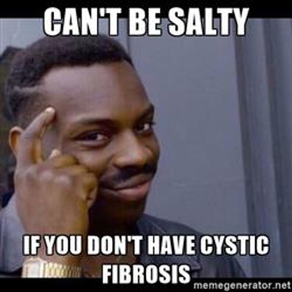 You know when you're outside in the summertime and it's hell on earth and it's inevitable that you're going to sweat (even if you are just walking from your house to your car) and it runs in your eyes? Normally, people just wipe it away and move on, right?? For a person with CF, it induces major burning, temporary blindness and sometimes tears. That's because our epithelial cells can't regulate the way our body's salt passes through the membranes in our body making us have A LOT of excess salt that comes out in our pores. So when we say we are salty... I don't mean I'm in a bad mood... I mean more along the lines of I could personally salt your fries with what comes off of my skin in the summertime.