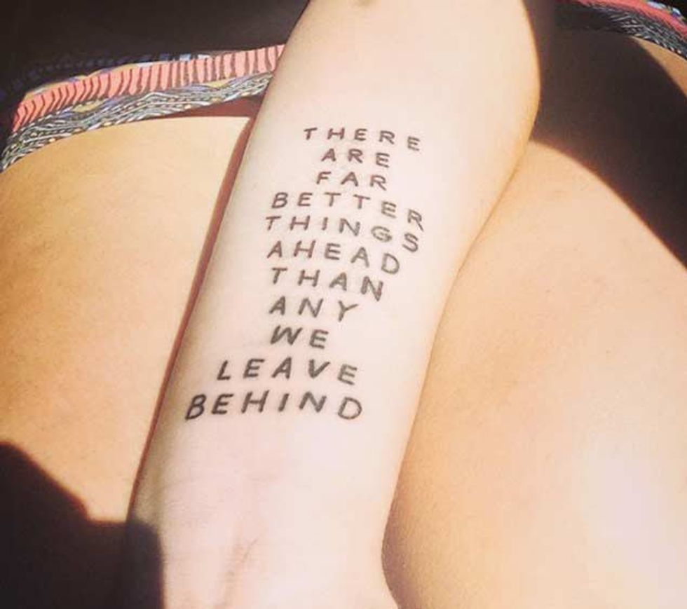 Words are unchanging. Believe it or not, you might have different values at a future point in your life. While the meaning and symbolism of images can change for a person, words always remain constant. Consider what words you want displayed on your body thoroughly. It might be wise to have one or two word phrases as a tattoo as well, so it's easy to get a feeling for the whole piece without having to read an entire set of song lyrics.
