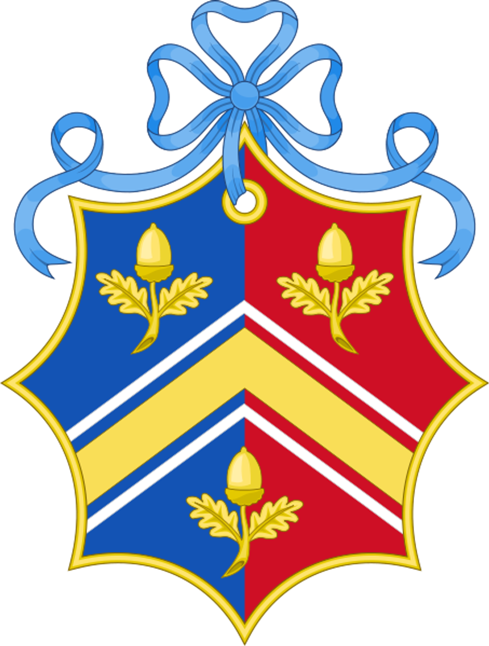 She uses her familial coat of arms. When Kate married William, she was entitled to have a coat of arms. However, before this actually happened, her father petitioned for a coat of arms. The acorns symbolize the three children of the family, Kate, Pippa, and James. The acorn hails from the oak tree which is common symbol of England and especially prolific in West Berkshire, the area where the Middleton family has resided. The blue ribbon adorning the top indicates Pippa’s status as an unmarried woman. The gold chevron emphasizes her mother, Carole Middleton nee Goldsmith, who is described as being the center of the family.