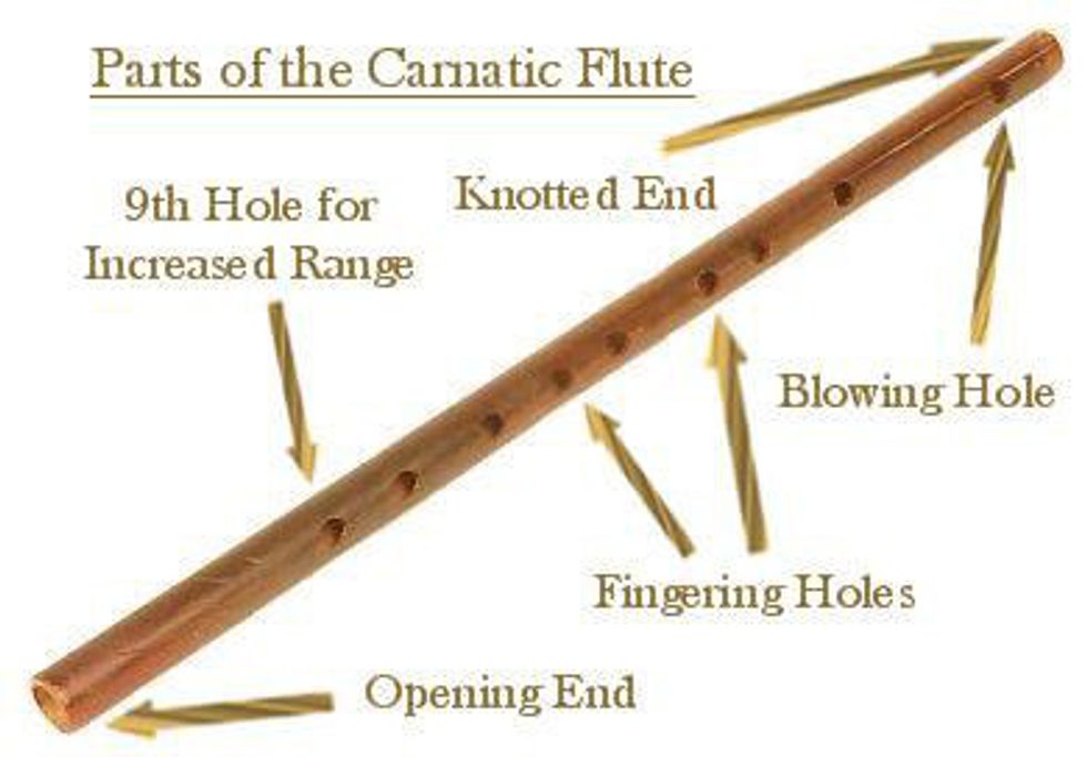 Unlike the Western flutes that you see in today's bands and orchestras, the Carnatic flute is made of bamboo entirely. It has a one-piece structure with a closed (knotted) end and an open end. Also, there are no fancy keys to press to get the notes out. It's all good old open holes! But, that means there are more options on transitioning between notes via fingering. The open hole system allows for a smoother transition between notes and therefore leads toward having a more fluid tone in the music being played. In other words, it's a very simple instrument with highly complex capabilities.