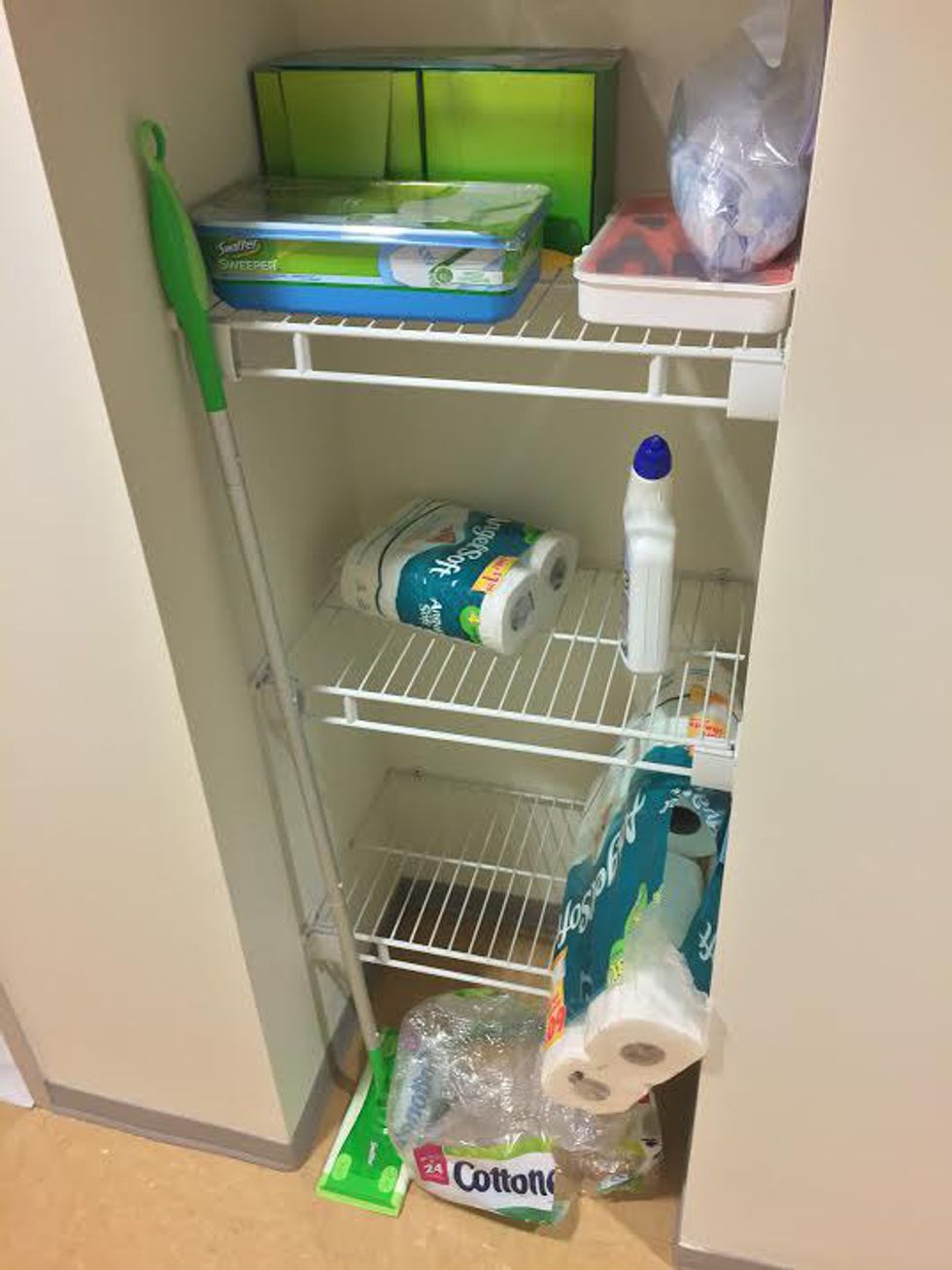 During my recent kitchen purge, I also whipped out the Swiffer I brought so that I could clean the floor that was practically in a committed relationship with bits of food. Granted, the mop saw a lot more than any mop should, but it came in handy for the hard to reach spots. Additionally, my one roommate revved up the vacuum and started cleaning the carpeted area of the apartment — the common area — with similar success