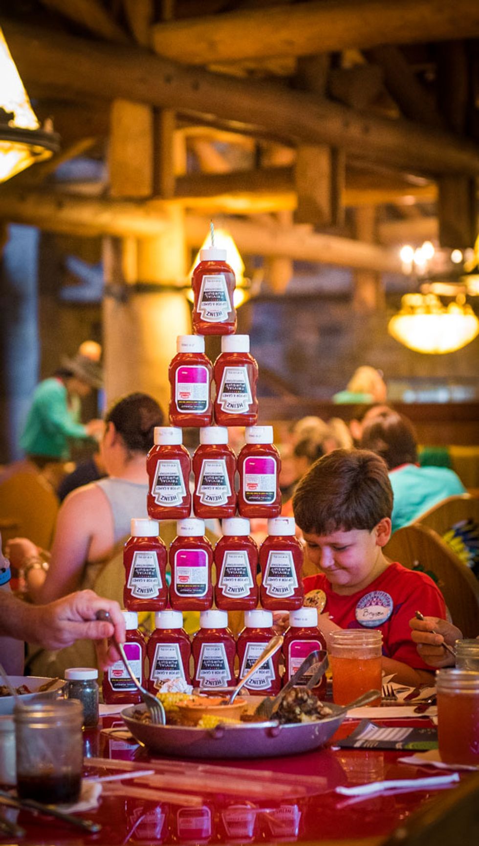 Although all of the restaurants at Disney World are family friendly, this one probably cuts the cake. When you order a small soda they will serve it to you in a thimble and when you order a large soda they bring it out in a barrel. The waiters and waitresses are really friendly since the restaurant has a southern theme and they are not afraid to give you and your party nicknames like "little flower", "big daddy" and "sweet pea". The best part of it all though is when you want ketchup. You have to scream "KETCHUP" and everyone who has ketchup on their table has to run over and put it on your table until there's no more room on your table for food.