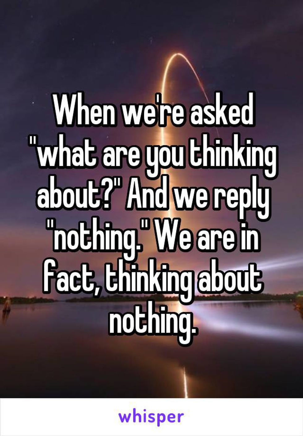 This notion is very simple......just don't complicate it. Us females like to overthink the word "nothing" when guys say this to us. I mean, they can't possibly be thinking about nothing.............can they? Well, I am here to clear the air.....yes, they are really thinking about nothing. I have learned to not stress out when my boyfriend says this to me. I just accept his response and move on.