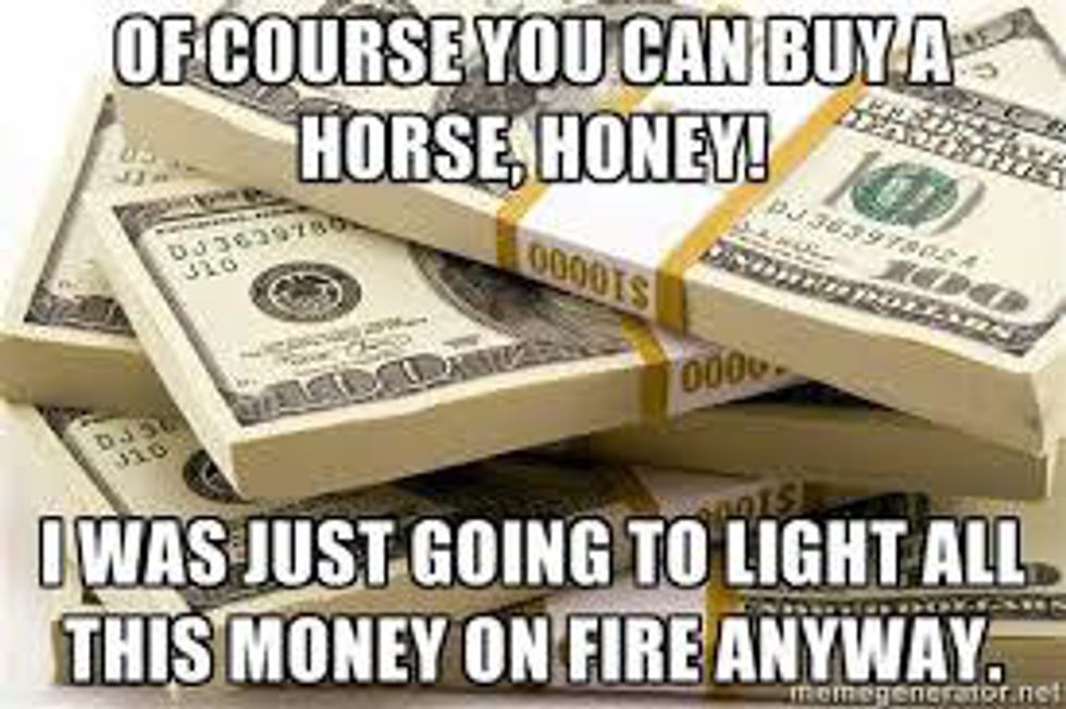 If you're broke already, please do not think that buying a horse is a good idea. I have played a lot of sports in my life: tennis, softball, dance, cheer, cross country and soccer. None of those sports compare to how much it costs to barrel race. Supplements, saddles, tack, boots, clothes, food, hay, trailer, truck, gas, entry fees, farrier, vet, dentist, chiropractor, etc, etc. Needless to say, you better have some pocket change if you wanna get involved in the equine world.