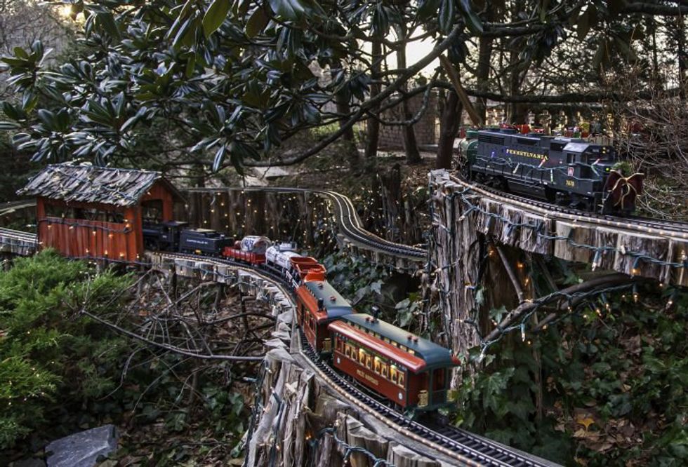 Morris Arboretum's Holiday Garden Railway showcases a mini winter wonderland, complete with a quarter of a mile model-train track. 15 rail lines and model trains that cruise past replicas of historic monuments and Philadelphia landmarks illuminated with thousands of twinkling lights.