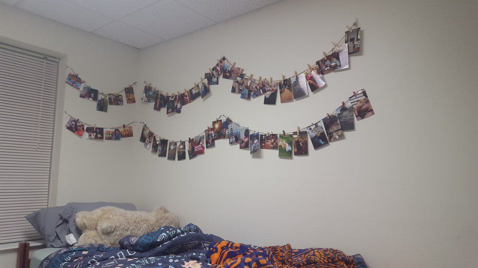 Before you print all those cute photos to decorate your dorm with please remember that a thing of command strips costs like $8.99. I personally chose to to put all my pictures on string with clips, which costs about $15 (not including the photos) to put together.