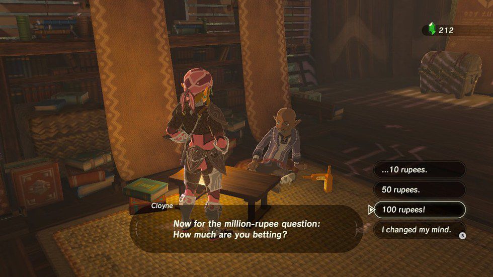 You are given the option to place a 10, 50, or 100 rupee bet and you pick from three chests, one of which contains triple what you bet. While you can't save after you place a bet, you can easily farm rupees by simply saving before you first speak to Cloyne, choosing the 100 rupee option to maximum the profit, and re-load your save file if you lose and save if you win!