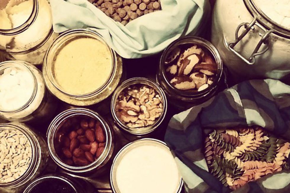 I got my mason jars from various garage sales and natural grocers. I use these in the bulk bin section. Simply weigh the mason jar, write down the tare, and fill with your desired item. Select Dillons and Whole Foods have bulk bin sections stocked with different kinds of granola, seeds, nuts, oatmeal, flour, sugar, rice, beans, and more. Bulk items are also cheaper than pre-packaged, and mason jars seal tightly to keep food fresh. My favorite bulk item is peanut butter. Whole Foods has a grinder that makes nut butters right before your eyes! No added junk and the oil doesn't rise to the top like the natural nut-butter that are pre-packaged. Mason jars are also perfect to-go cups for coffee, smoothies, juices, or packing a lunch.