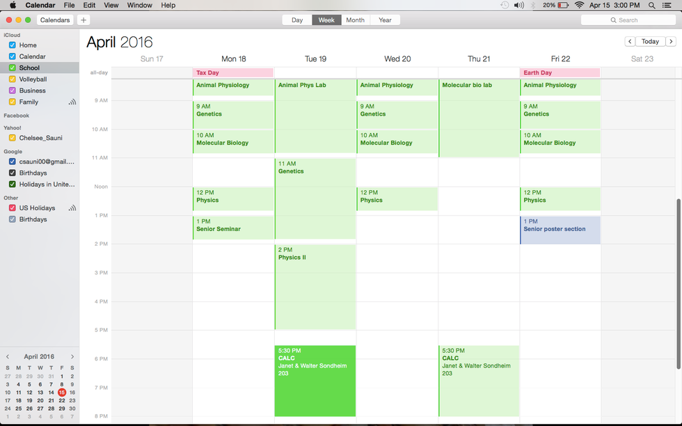 Tip #1: Do not take a huge course load. There is a reason why advisors give you an education planning track to follow when scheduling classes. During your senior year, you want to be able to focus your time on planning for yourself and the future after graduation. This is a big mistake that I made when I scheduled my classes for this semester. I am currently pushing myself to take 21 credits (6 courses) and quite frankly I am burned out about now. I never have time during the day because if I am not in class, then I am doing assignments . As a biology major, a lot of my courses require laboratory time in addition to lectures. To give an example of how bad it can get I will give you an idea of my schedule.