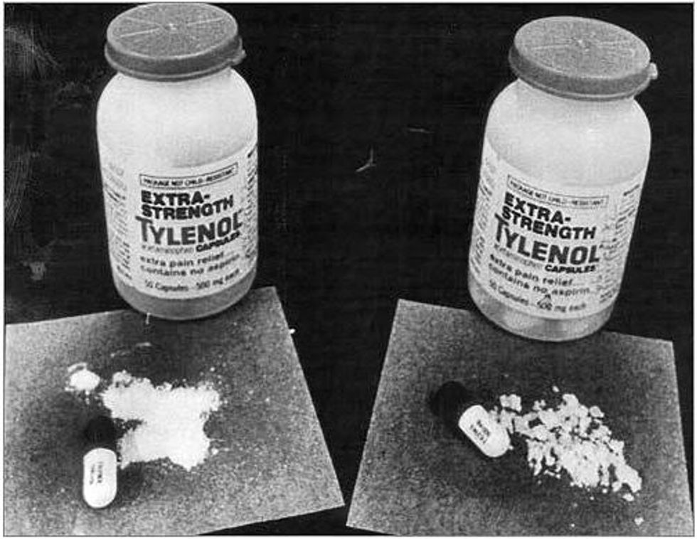 In Chicago in late 1982, several bottles of extra strength Tylenol-brand pills laced with potassium cyanide killed over five people within days, three of which were in the same family on the same day. Mass hysteria ensued, with over 1,200 cases called in of potential cyanide poisoning after the news had been let out about the first few fatal cases.