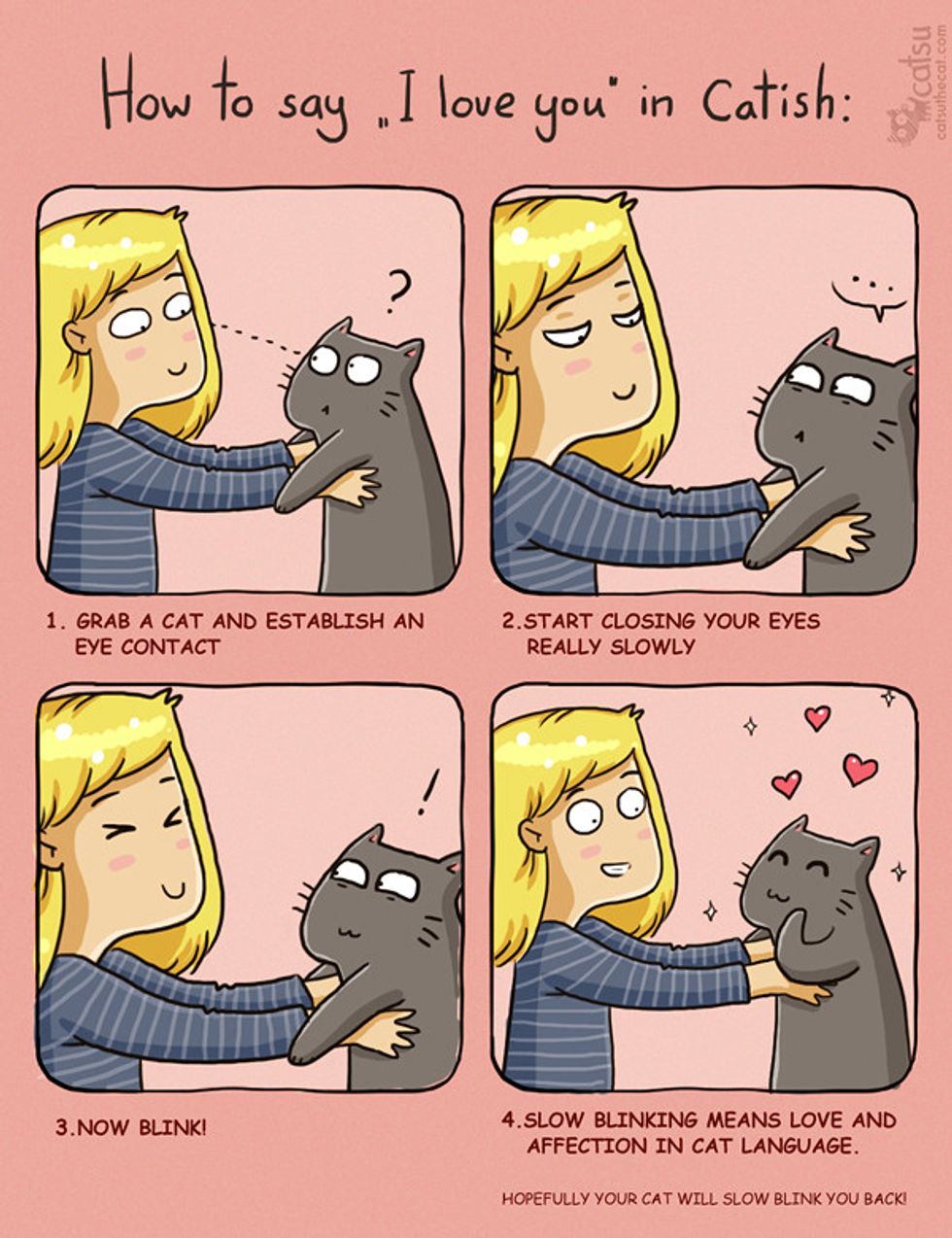 When your cat is staring and purring at you, they'll slowly close their eyes and open them again. This isn't because they're having some sort of staring contest with you. Slow-blinking is a way of saying "I love you" in cat! So if you love your cat, be sure to blink back.