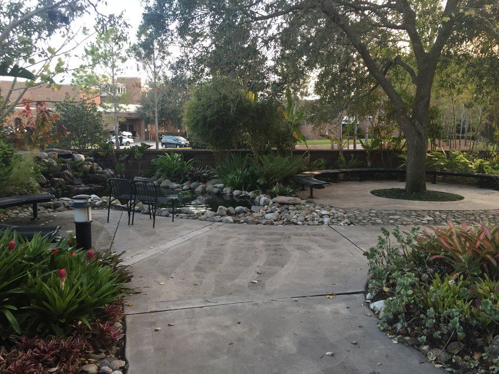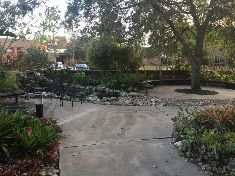 “Sanctuary” is the first word that comes to mind when thinking of this hole-in-the-wall. This zen corner is hidden behind bushes and tucked away behind the Student Union. If studying outside is your thing, or if it’s cold enough to bear sitting outside for more than a few minutes, this is a place you’ll want to check out. The benches lining the edges are big enough for spreading out your books and bags. At dusk, the lights from the building spill outside for an atmosphere that resembles something out of Winter Park.