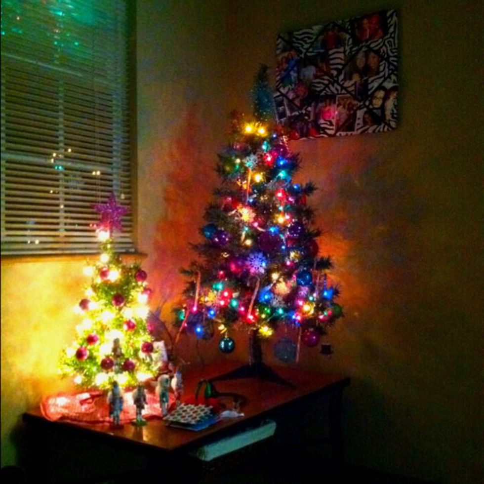 Yes, going out and getting a tree like the one in your living room at home isn’t exactly cost or space effective anymore -- but that doesn’t mean you can't have one. Plenty of places sell cheap miniature trees (most even pre-lit) that fit perfectly in your room. Trust me, you want to make space for this.