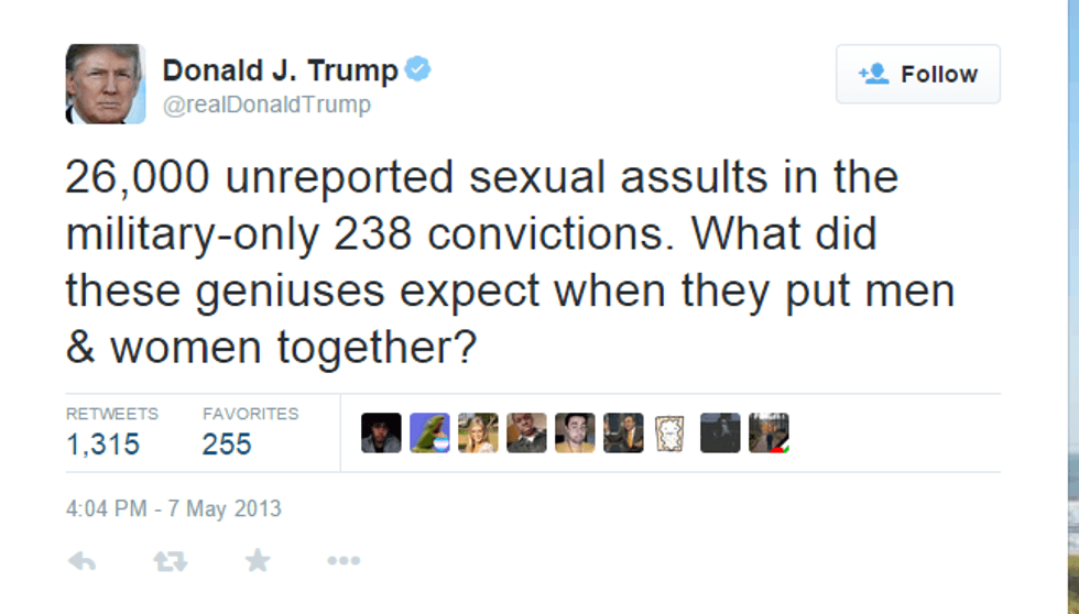 Lastly, Trump tweeted this awesome response (note sarcasm) to a report about the unreported sexual assaults in the military: “26,000 unreported sexual assults in the military-only 238 convictions. What did these geniuses expect when they put men & women together?” Later he tweeted, “The Generals and top military brass never wanted a mixer but were forced to do it by very dumb politicians who wanted to be politically C!” Thank you, Trump, for letting us know that apparently whenever you put men and women together, rape is prone to happen and our government is the stupid one for allowing both men and women to fight together for our country.