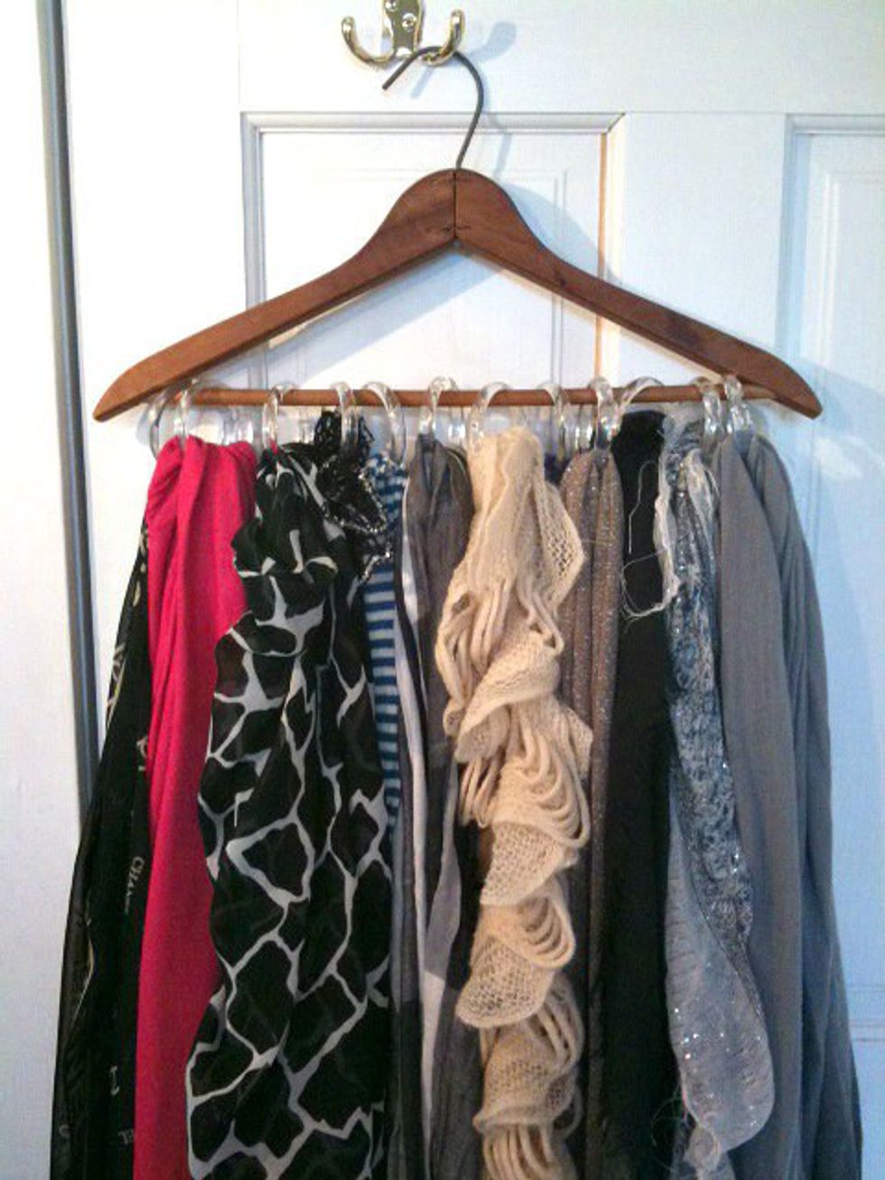 This trick saves a lot of room for more clothes in the closet! It will also be much easier to find the scarf you want when looking at all of the them lined up each day.