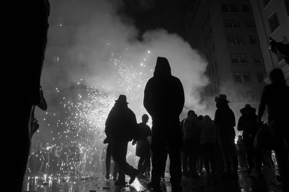 Tourists and Locals watch a fireworks parade in Barcelona, Spain