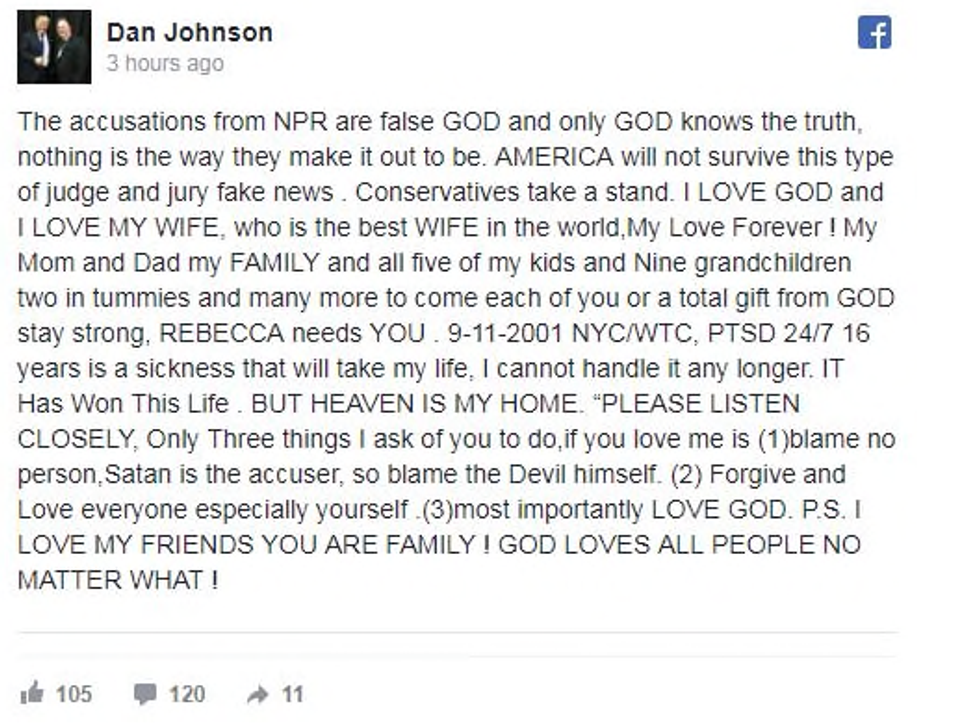 Representative Dan Johnson died of a self-inflicted gunshot wound to the head on Wednesday. This was two days after the Kentucky Center for Investigative Reporting published allegations that Johnson molested a high school girl when she was 17 and he was 53. Hours before he shot himself, he left a disturbing Facebook status: