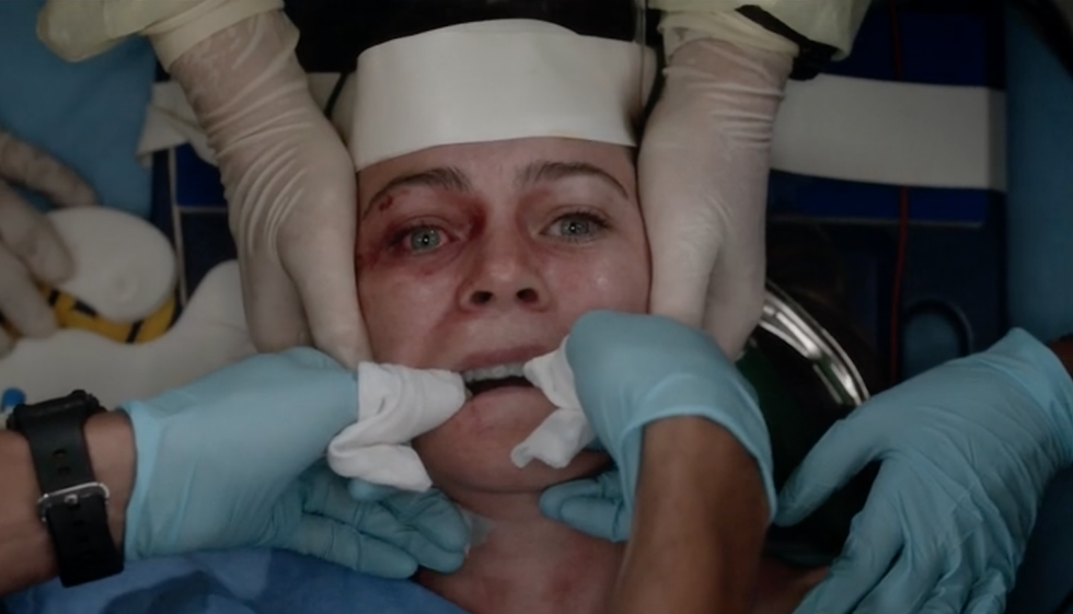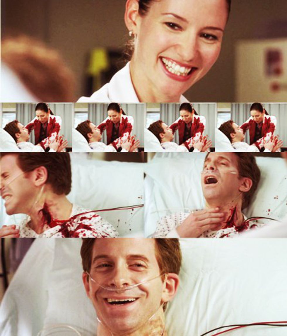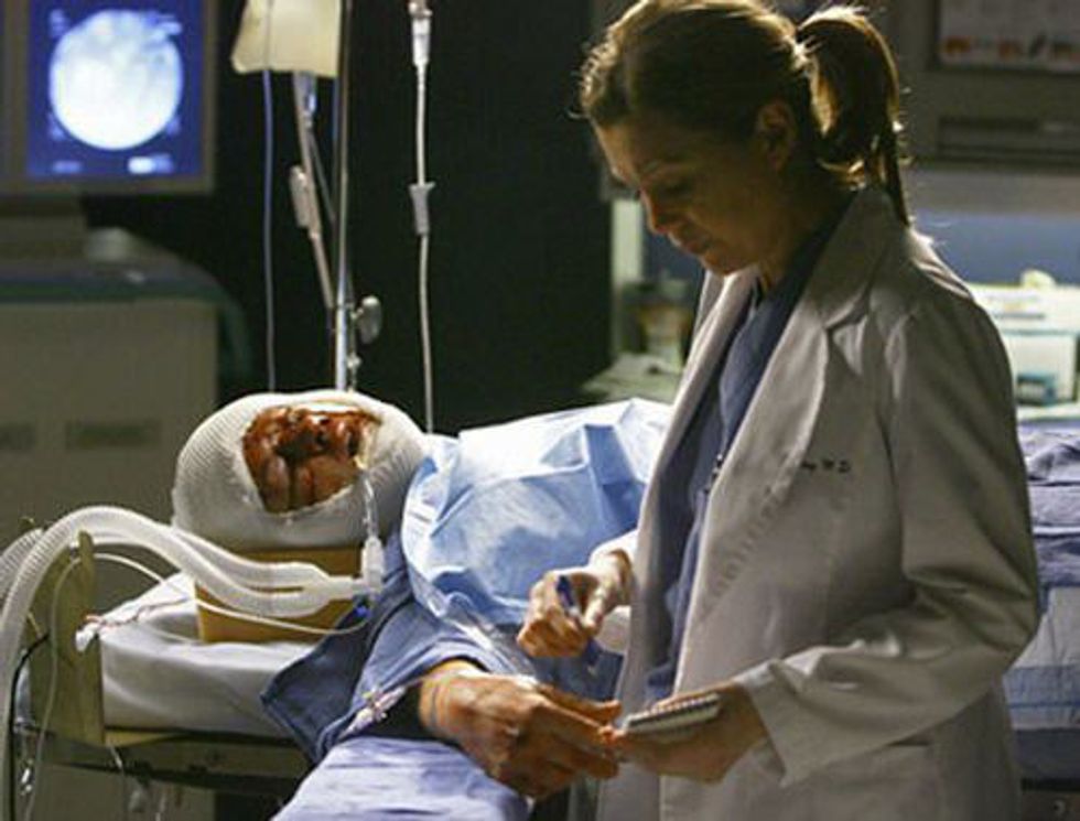 Lou, a patient that came in, had a seizure but they were able to sedate him. Meredith sent here team after one thing or another and she ended up being left in the room alone. While typing away on the computer Lou got up behind her, sort of unconscious, and Meredith tried take make him lay back down. But, Lou was not aware of what was going on started to become aggressive and grab Meredith and throw her against the walls. She ended up having her left elbow dislocated, left knee swollen, left ribs fracture, neck bruises and swelling, collapsed lung, and a broken jaw. Once she was stabilized, the staff realized that she was unable to hear anything they said.