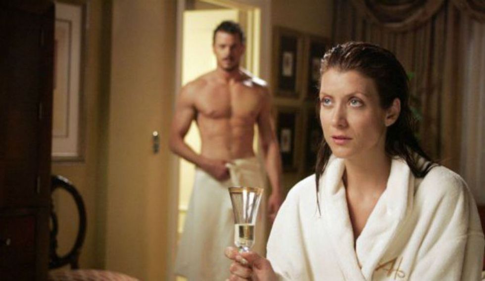 Derek goes to Addison's hotel room to apologize to her about failing their marriage, and that he was officially leaving her and getting a divorce so he could be with Meredith. But after he apologizes Mark Sloan, his ex-best friend and the man Addison cheated on him with, walks out of the bathroom with nothing on but a towel.
