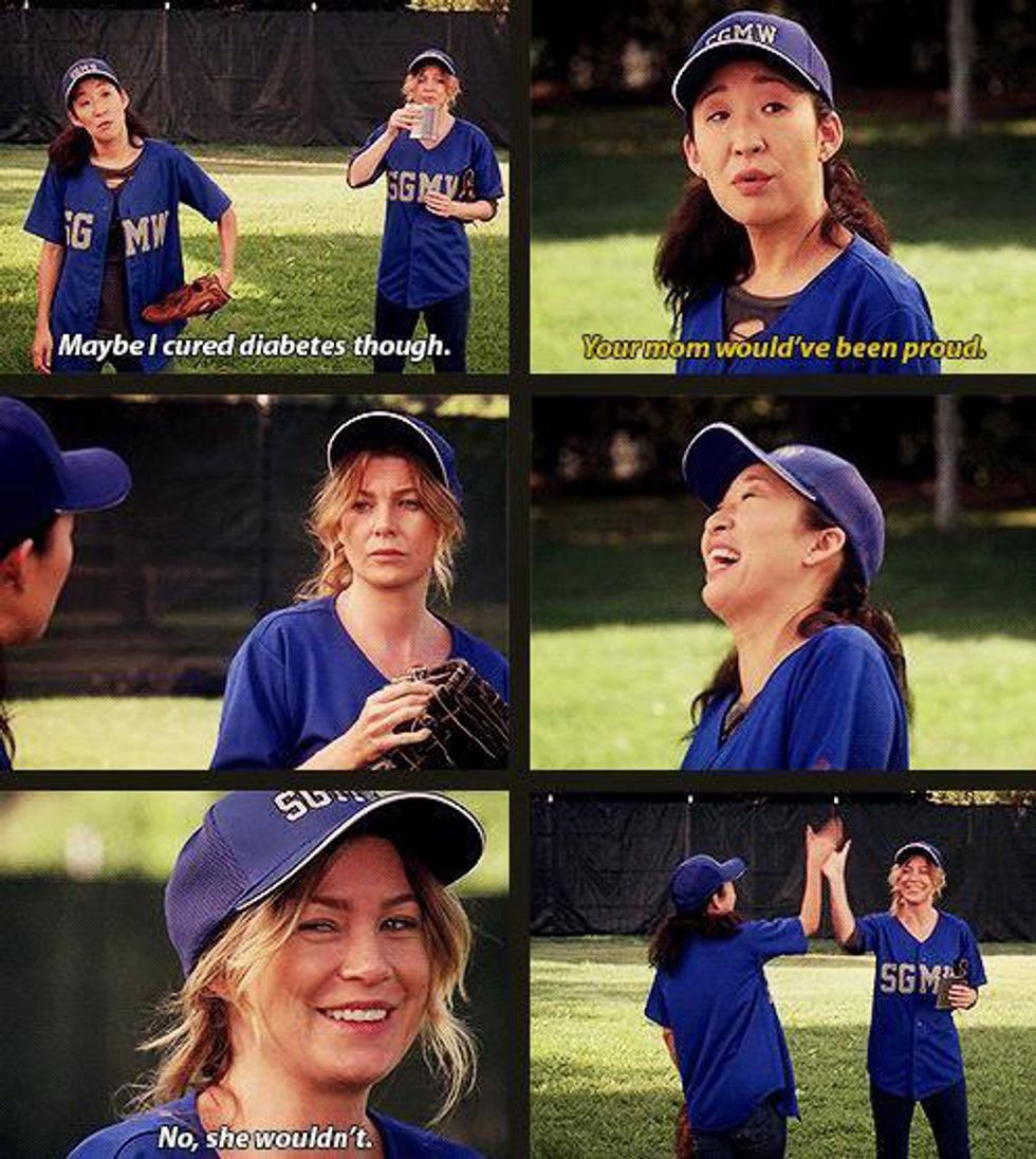 Owen Hunt wants the doctors to have better teamwork so he creates a baseball team. But the Meredith and Cristina are not interested in the game but in their research.