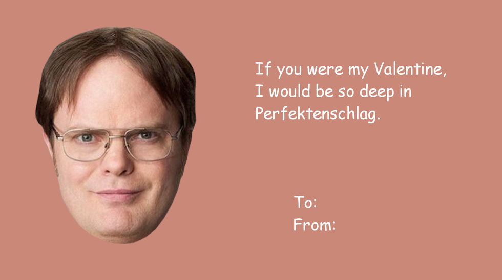 "I really like Valentine's Day in this office. It's kinda like grade school. Everybody gives out little presents and stuff. Like last year, Jim gave me this card, with Dwight's head on it, it was horrifying and funny and... " Pam Beasley, the Office.