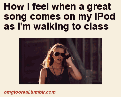 19. *Sings sad song in head and trudges to class, then starts to fast walk because you realize you're late again*