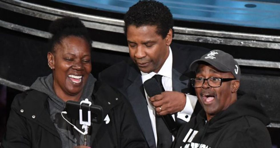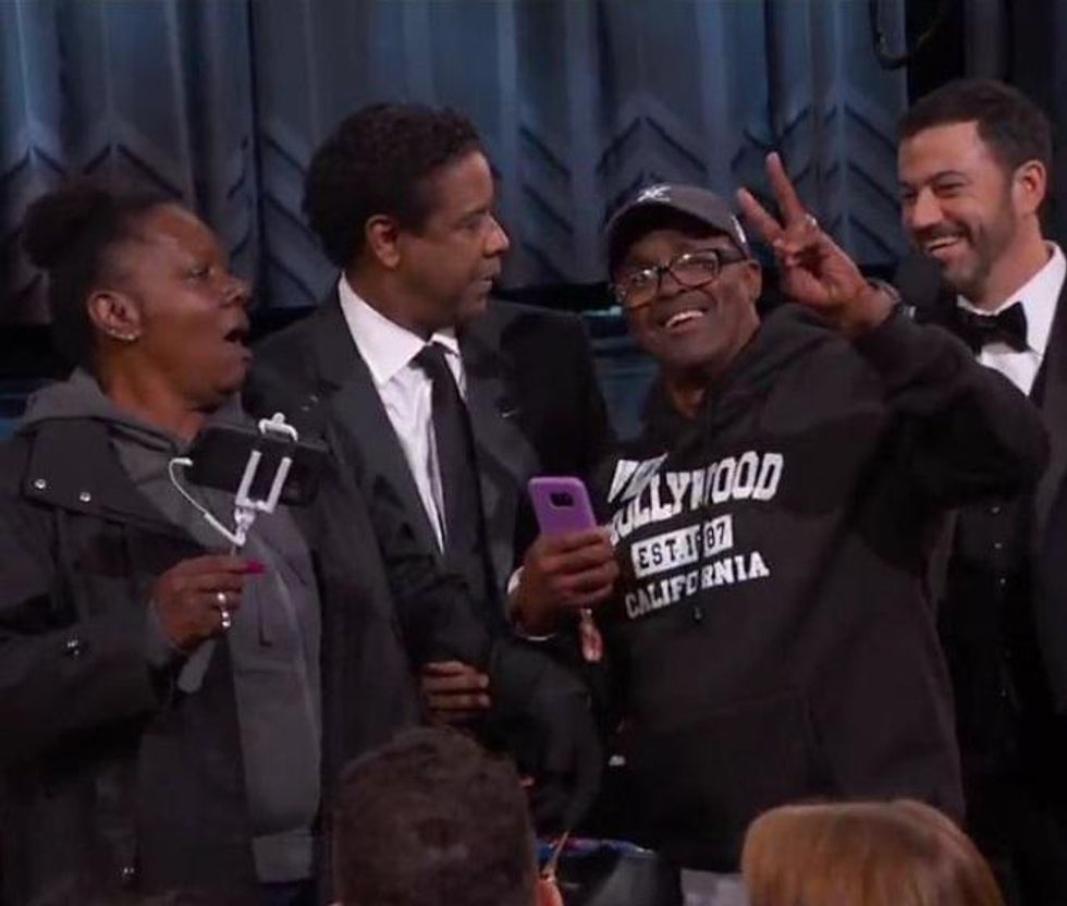 20. Okay, so I totally didn't listen when they said who this large group of people that they were surprising by bringing them to the Oscars and I'm really confused now. But I'm loving this guy recording the whole thing on his purple phone.