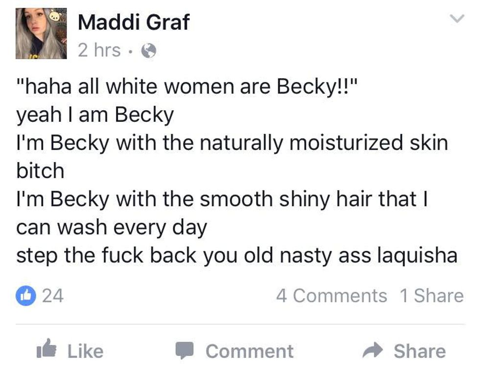 Just like a typical Becky, not realizing that people of color can't be racist, and giving her opinion where it isn't needed. She later goes on to tweet about Black boyfriend Nick Young... typical.
