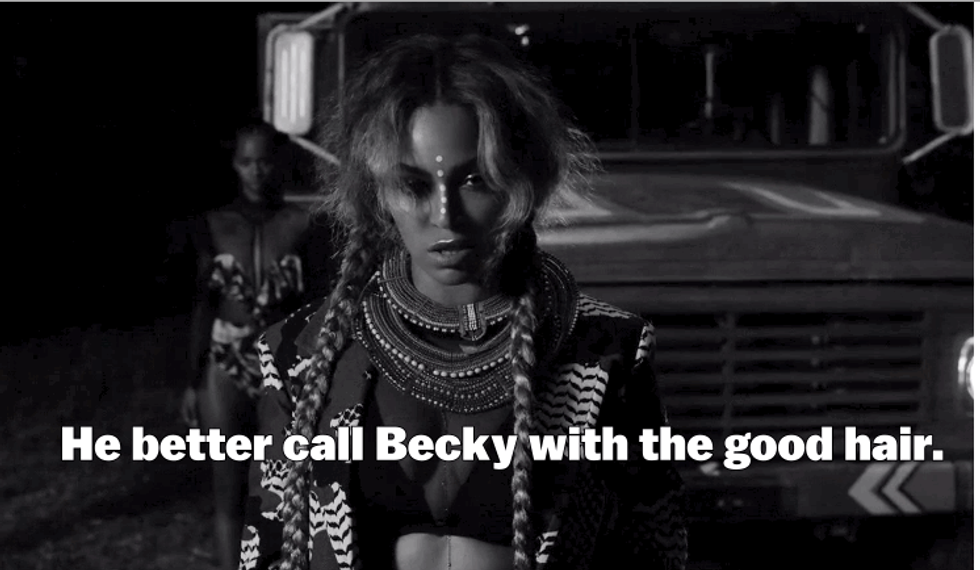 The Bee Hive has been buzzin' consistently since Beyonce's HBO release of Lemonade. My timeline was flooded with Black girls praising the imagery, lyrics, and symbolism of the album. It wasn't too long before the memes too flooded in. They offered up hilarious images of Jay-Z in response to Beyonce's cheek and tongue lyrics. The same lyrics that allowed for speculation about unfaithfulness on Jay's part. The song "Sorry" is an empowering break up song as she sings of middle fingers up, "I ain't thinkin' 'bout you." The song ends directing the cheating partner to "call Becky with the good hair." Just as quickly as my timeline flooded with positive responses it wasn't too long before the negative ones poured in. Countless White women ran to twitter to exclaim their distaste for the album. Many began to insist that the term "Becky" was a racial slur. Along with that claim came other racial slurs and insults flung at Black women. Tweets like the following show the duality of allegedly being insulted by a racial slur while wielding another.