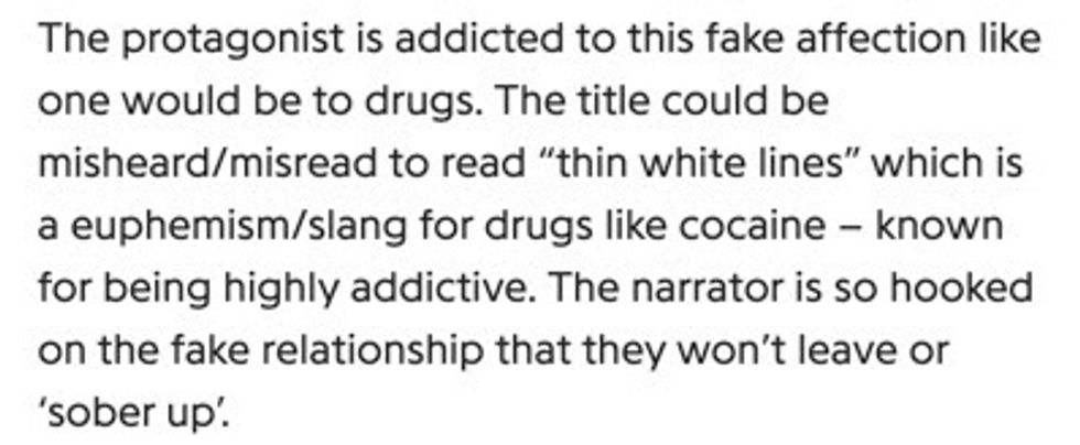When it comes to the song's chorus and title, some fans have observed that it could be misheard as "thin white lines" and connected this back to the story within the song.