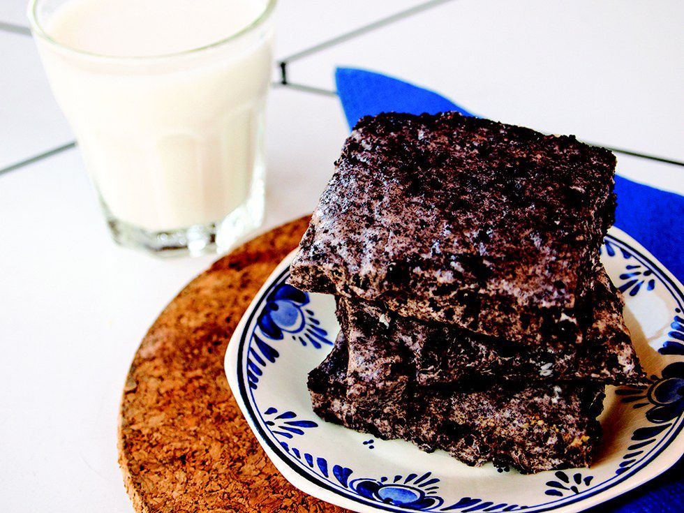 For this recipe, you'll need a baking sheet, but no actual baking is required. You'll need a package of Oreos, a large package of marshmallows, and butter. To begin, line the baking sheet with aluminum foil. Next, fill a Ziploc bag with Oreos and crush them until no large pieces remain. Melt together the butter and marshmallows in a large microwave bowl for two minutes and add in Oreos when completely mixed. Press this mixture onto the baking sheet and allow to cool for 10 minutes. Cut into bars (or eat as one really big bar) and enjoy!