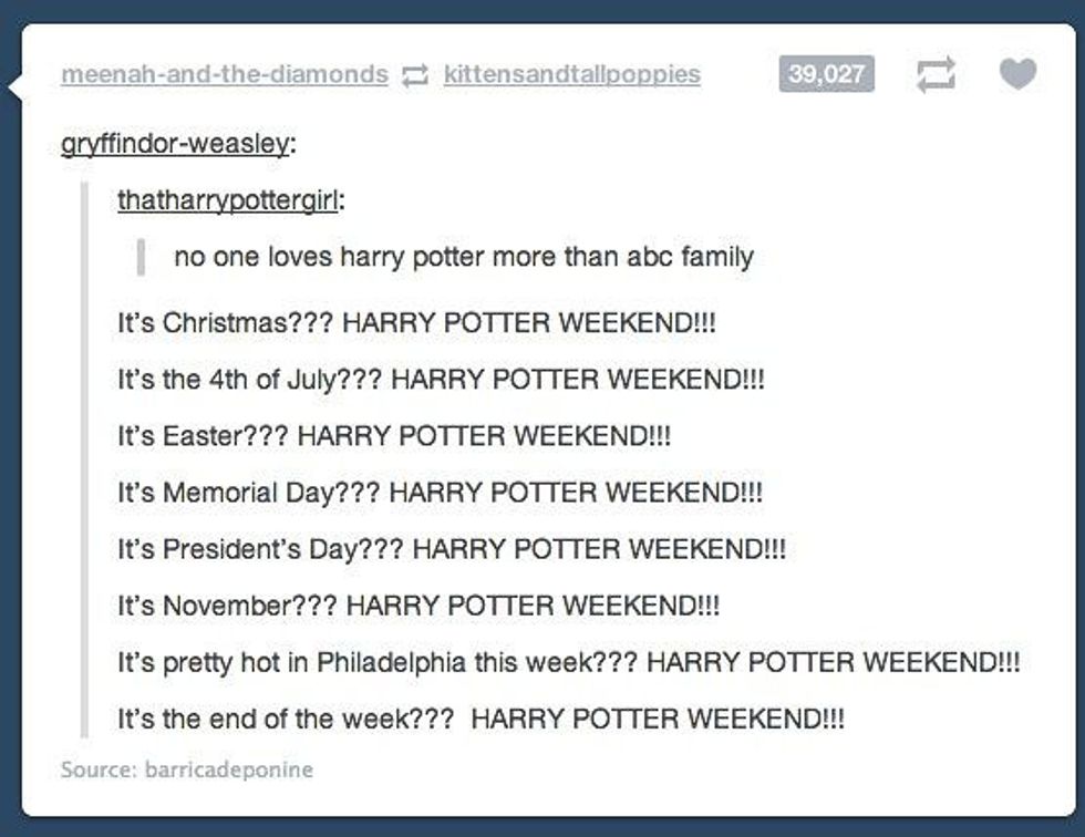 4. Shamelessly watching/reading Harry Potter for long periods of time, especially during ABC Family Harry Potter Marathon.
