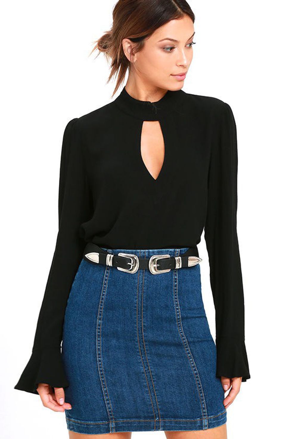 Just because the weather is getting a little nippy doesn't mean you have to put away your mini skirts just yet! Opt for a suede material and pair it will booties and a simple top. Find this one at nastygal.com for $88. If you are loving this look, be sure to check out suede dresses, too!2. And while we're on the subject of skirts, DENIM!