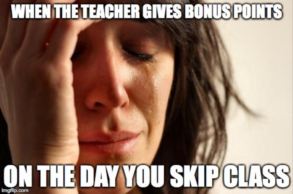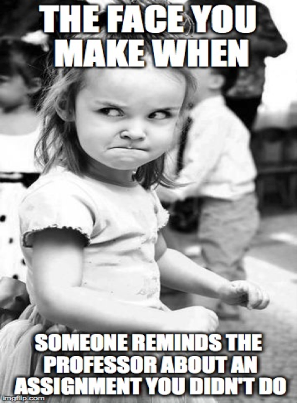 We all know this one. You walk into class, not a care in the world, when all of a sudden, you notice an assignment neatly placed on everyone’s desk—except yours, of course. Panic starts to ensue. You ask the kind girl sitting next to you why everyone is turning something in (because you know the first assignment isn’t due until next class period), and she politely ruins your day because, well, you were wrong.